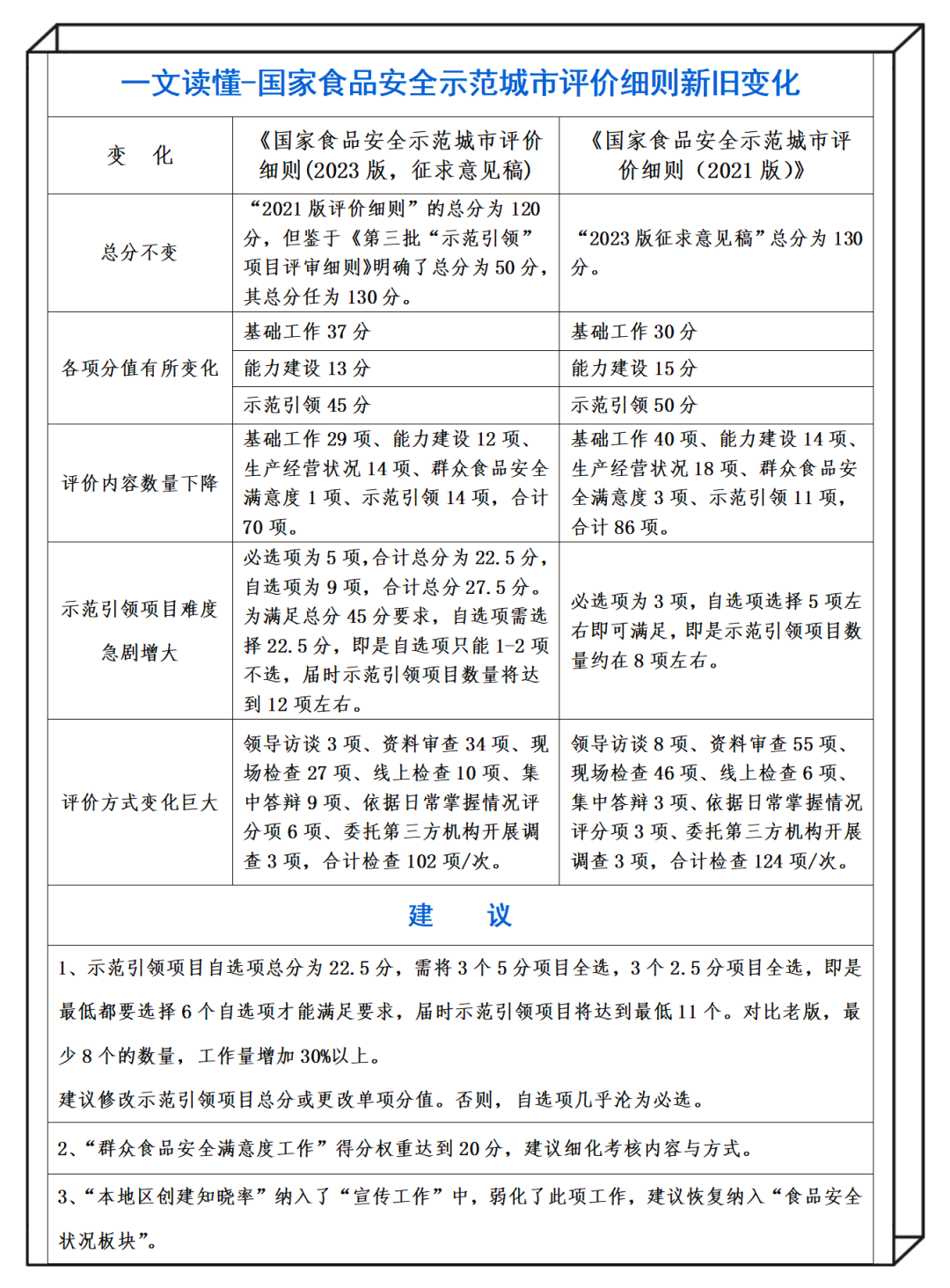 “2023版征求意见稿”基础工作总分为37分,高于“2021版评价细则”的30分。“2023版征求意见稿”能力建设为13分,低于“2021版评价细则”的15分。“2023版征求意见稿”示范引领为45分,低于“2021版评价细则”的50分(依据《第三批国家食品安全示范城市创建“示范引领”项目评审细则》)。