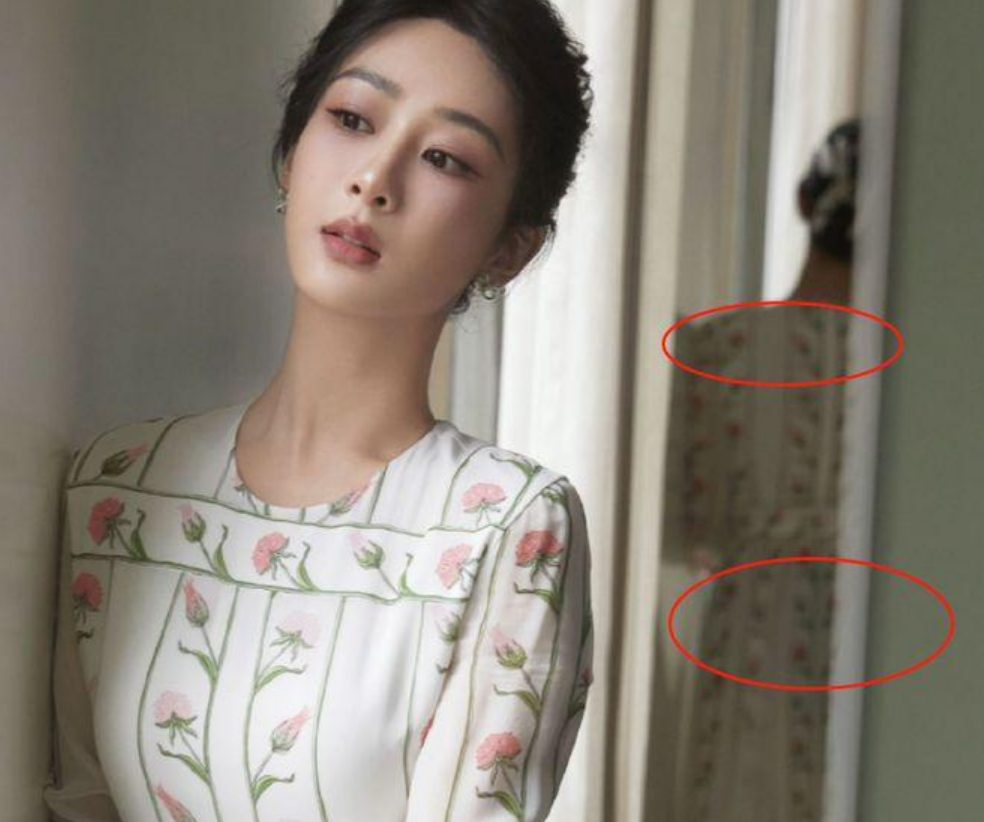 眼尖的人发现在她身后的镜子中的身影,跟她的照片是截然不同的画面。