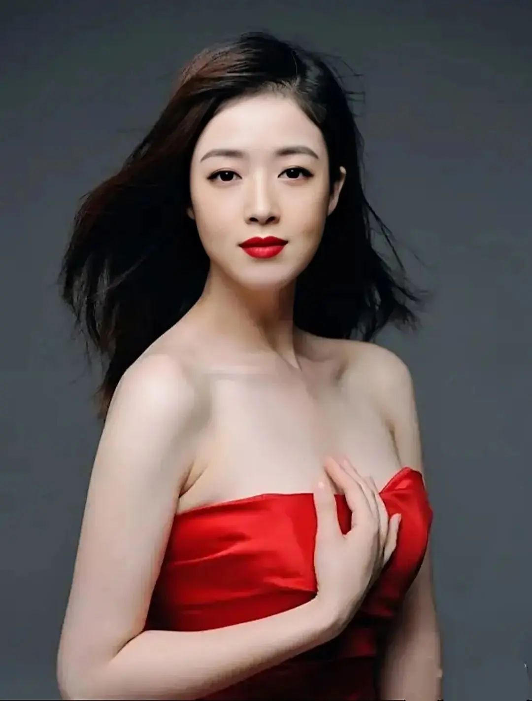 在镜头前,身穿一身长裙,但是却下意识地把手放在胸前。