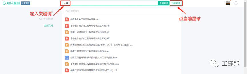 比如搜索【中建】相关资料,在顶部搜索栏输入【中建】,点击当前星球