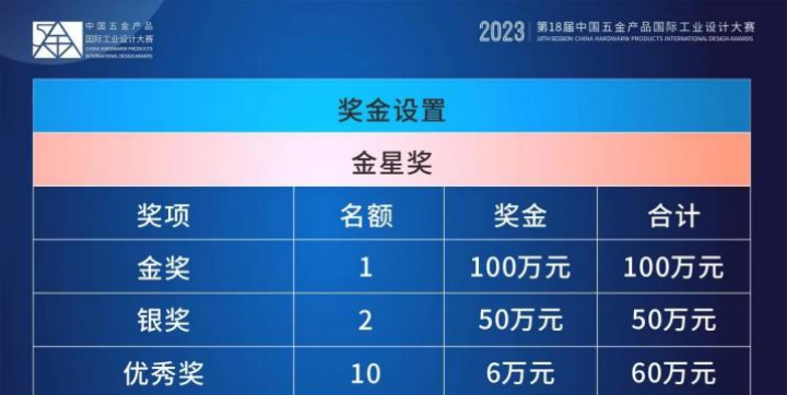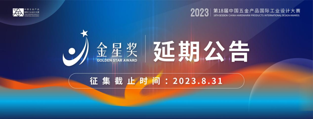 应广大参赛者和部分院校指导老师的延迟截稿要求,经2023年第18届中国五金产品国际工业设计大赛组委会商议决定:将金星奖作品征集截稿时间由原定的7月31日延期至2023年8月31日晚24:00。现大赛提供充足时间,欢迎有意参赛的设计师、师生们踊跃参与,创作优质作品!(注:创意类五个分项赛的截止日期不变,仍为2023年10月10日24时)