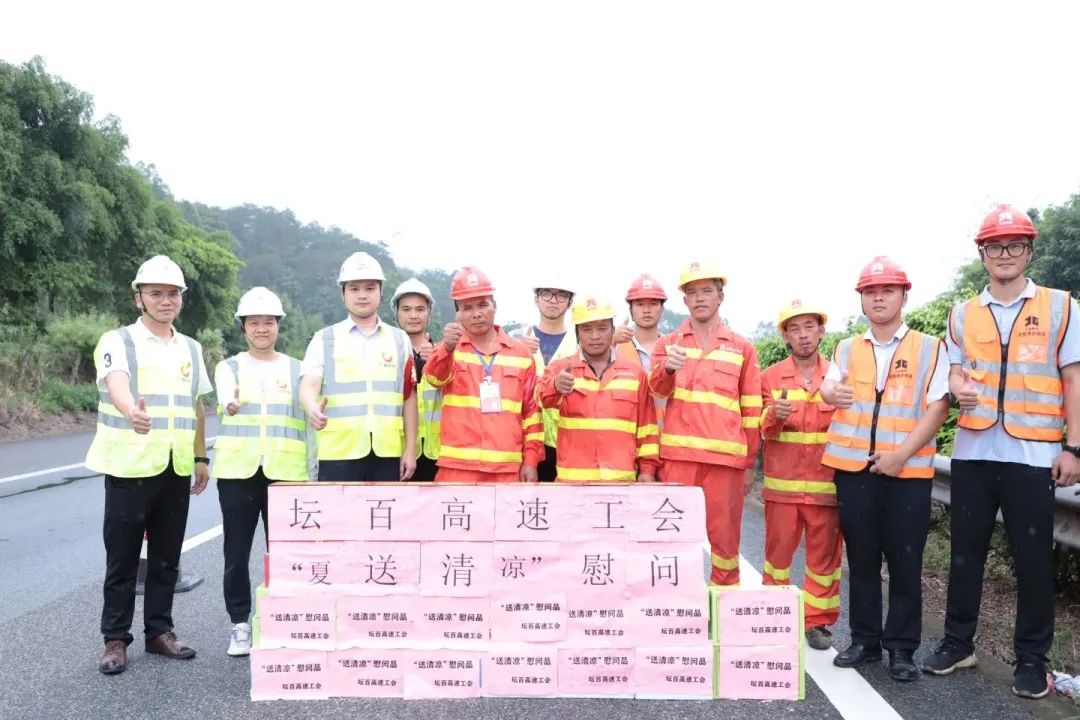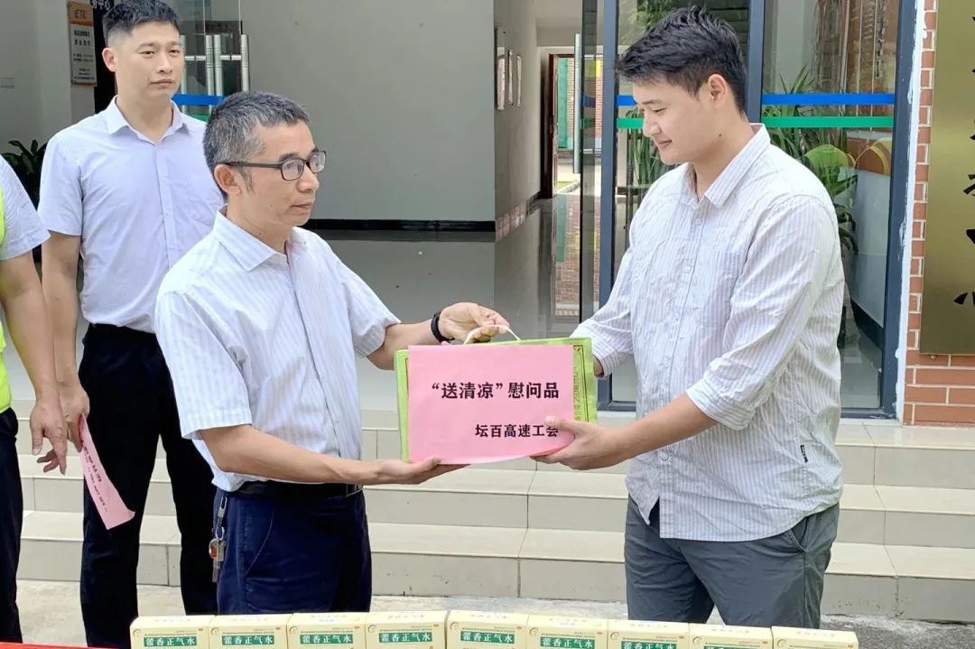 坛百公司分别深入坛百高速沿线涉路施工点、服务区、收费站,慰问高温下依然坚守一线的员工,向员工表达深切的慰问和感谢,并送上藿香正气水、王老吉、八宝粥、矿泉水等解暑物品。