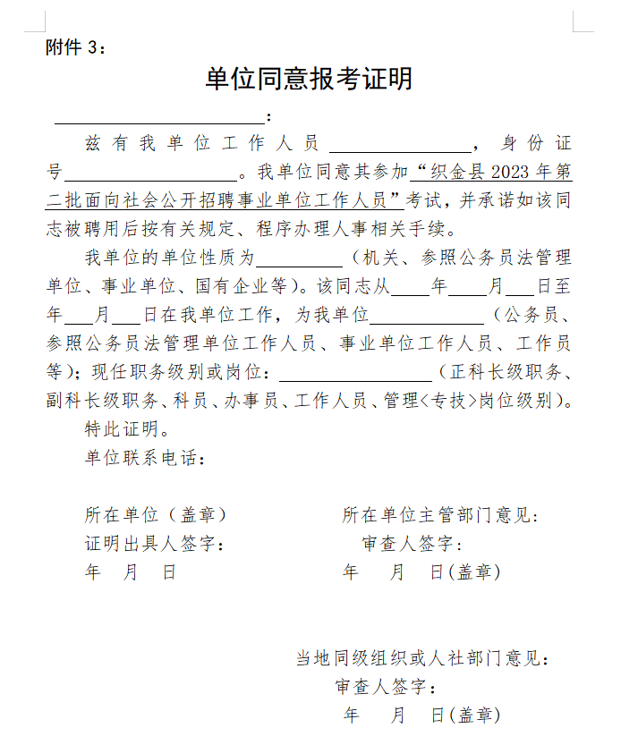 4.国有企事业(含国有集体组织)在职在岗人员须提供具有人事管理权限部门同意报考证明(档案存放于私企的人员也须提供单位同意报考证明,其他情况无需提供)原件。