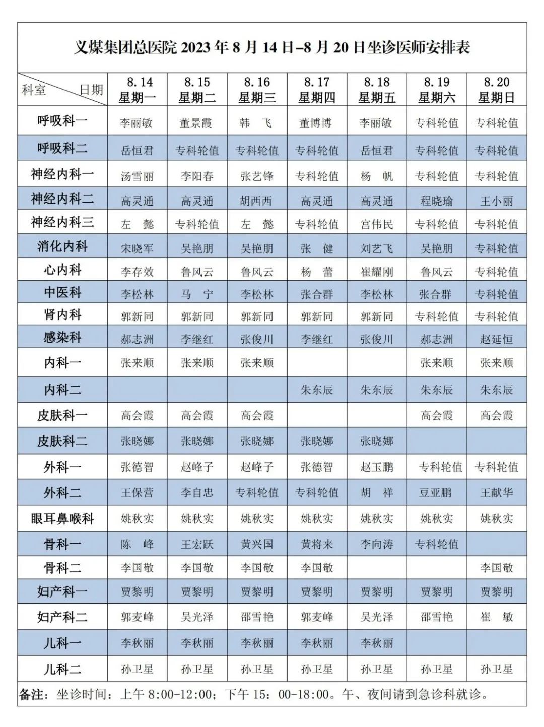 为了方便患者就医,义煤集团总医院本着“以患者为中心”的服务宗旨,执行“无假日医院”诊疗制度,现将下周(8月14日-8月20日)门诊医师坐诊时间安排如下: