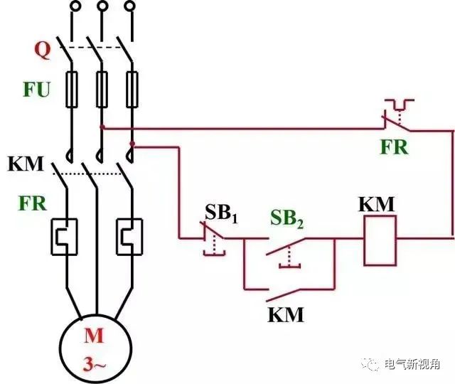 合上闸刀开关Q,按下SB2,接触器线圈KM通电,其主触头和辅助触头同时吸合,电动机运行。按下SB1,控制电路断电,主触头和辅助触头同时断开,电动机停车。