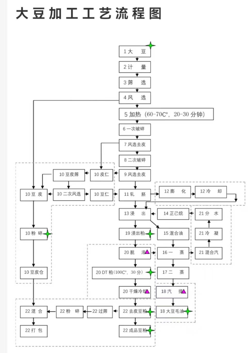 大豆是豆科大豆属的一年生草本植物,原产于中国,在中国各地均有栽培,同时广泛栽培于世界各地。大豆是中国重要粮食作物之一,其加工副产物种类较多,其中常见作为饲料原料的油豆粕、豆油、大豆磷脂油、发酵豆粕、大豆磷脂油粉、膨化大豆等。大豆的加工工艺具体如下图: