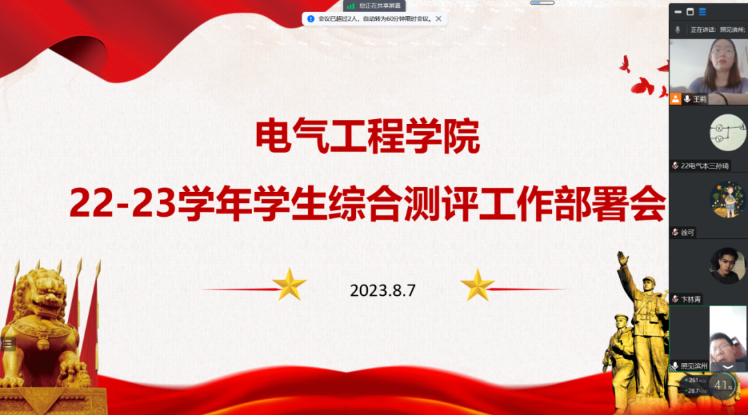 为进一步使学生综合测评工作规范化、科学化、透明化,加强学生综合素质测评制度化管理,明确工作目标、任务和时间安排,切实发挥综合测评对学生培养的积极导向作用。8月7日上午10点,电气工程学院召开22-23学年学生综合测评工作部署会,我院党总支副书记张志,副院长贾荣丛,各年级辅导员,20-22级各班班主任、班长、团支书、学习委员及学生代表参加会议。会议由辅导员王莉主持。