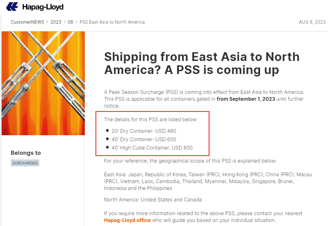 近日,赫伯罗特官网发布公告,2023年9月1日起,从东亚到北美的所有集装箱货物征收旺季附加费(PSS),直至另行通知。