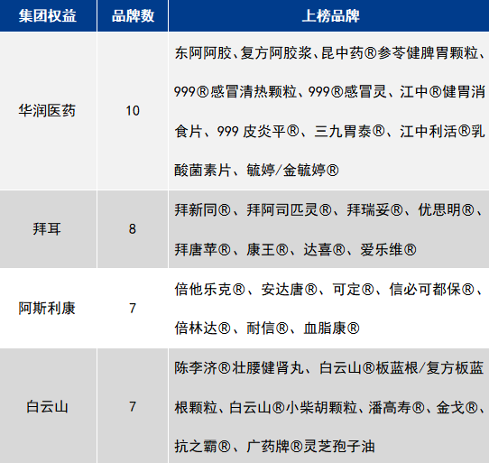 华润医药成为“2023健康产业品牌榜”的最大赢家,包括有东阿阿胶、昆中药®参苓健脾胃颗粒、999®感冒灵、三九胃泰®等10个上榜品牌。拜耳集团拥有8个上榜品牌,包括康王®、达喜®、爱乐维®等 OTC品牌和拜新同®、拜阿司匹灵®、拜瑞妥®等处方药品牌。白云山和阿斯利康均有7个上榜品牌,实力不分伯仲,白云山在中药OTC品牌领域更具优势,包括:陈李济®壮腰健肾丸、白云山®板蓝根/复方板蓝根颗粒、白云山®小柴胡颗粒、潘高寿®等知名品牌。阿斯利康的上榜品牌则集中在慢病领域,包括安达唐®、倍他乐克®、可定®、血脂康®等知名慢病用药。