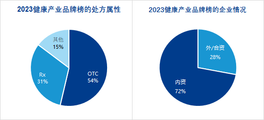 “2023健康产业品牌榜”54%为OTC品牌,处方药品牌占31%,从数量方面对比,OTC品牌显然更具有行业的竞争优势。“健康中国2030”战略促使我国医药健康产业规模快速成长,一批具有较强竞争力的内资企业也在不断崛起,“2023健康产业品牌榜”上榜品牌中,内资的品牌占72%,在多个细分品类中扮演重要角色。