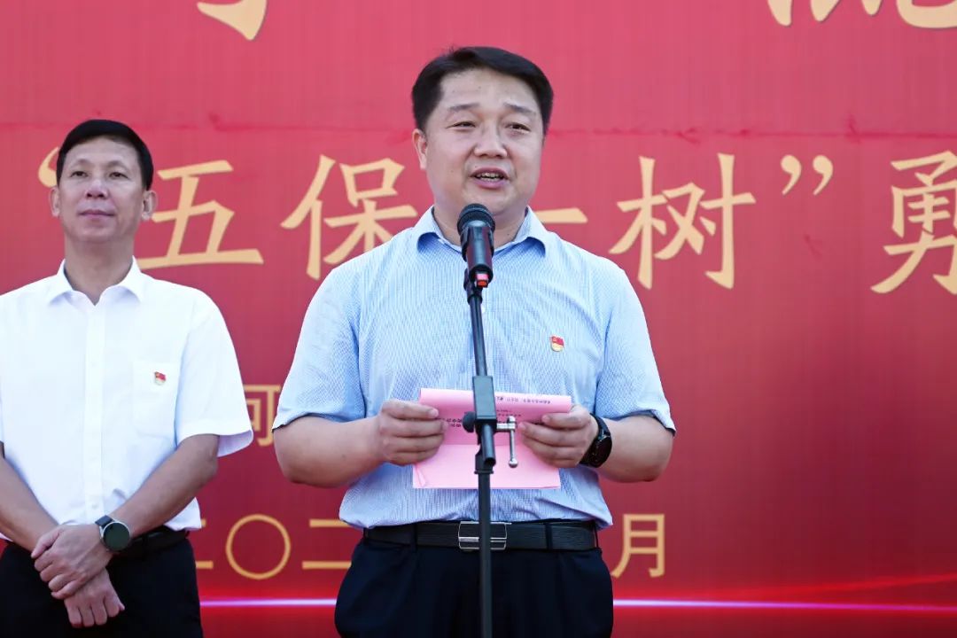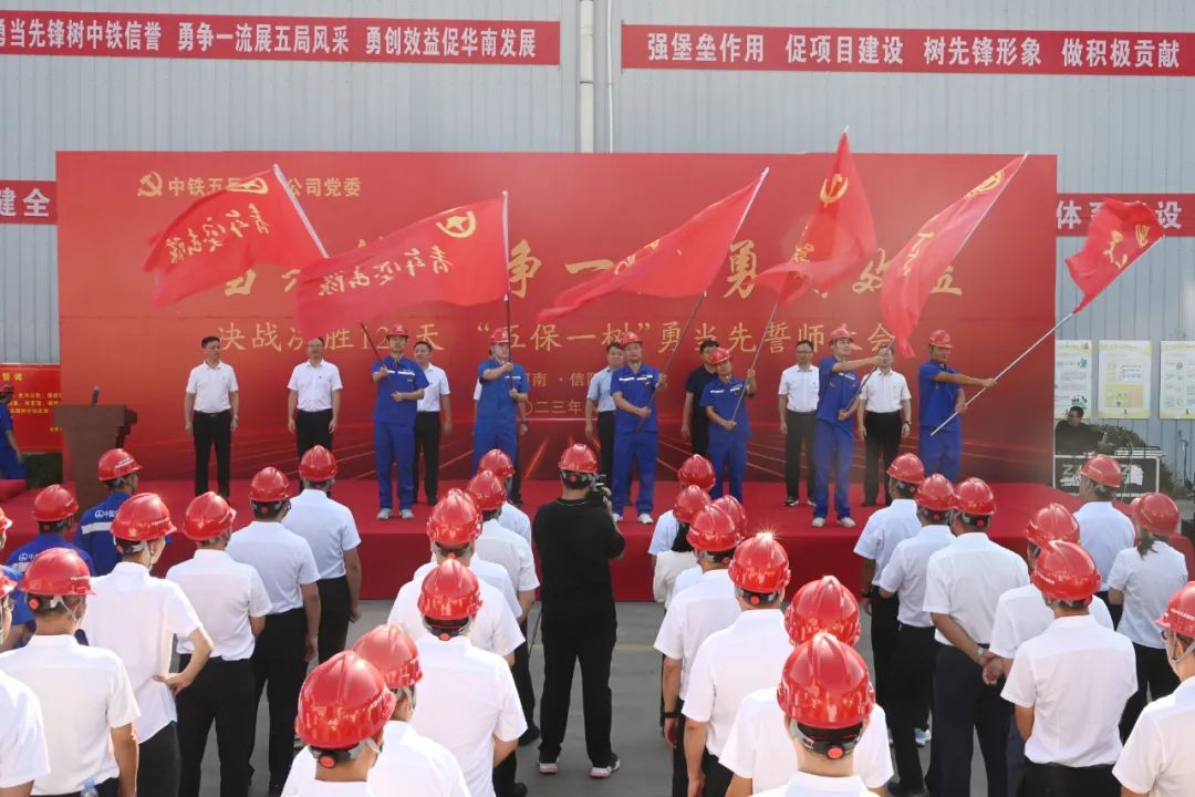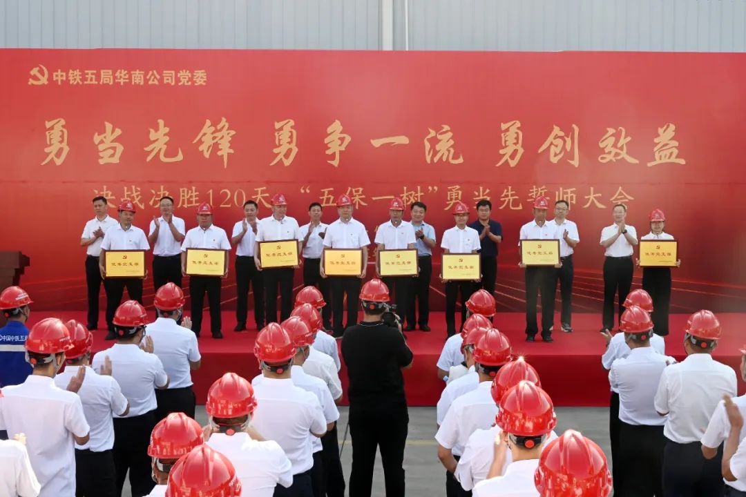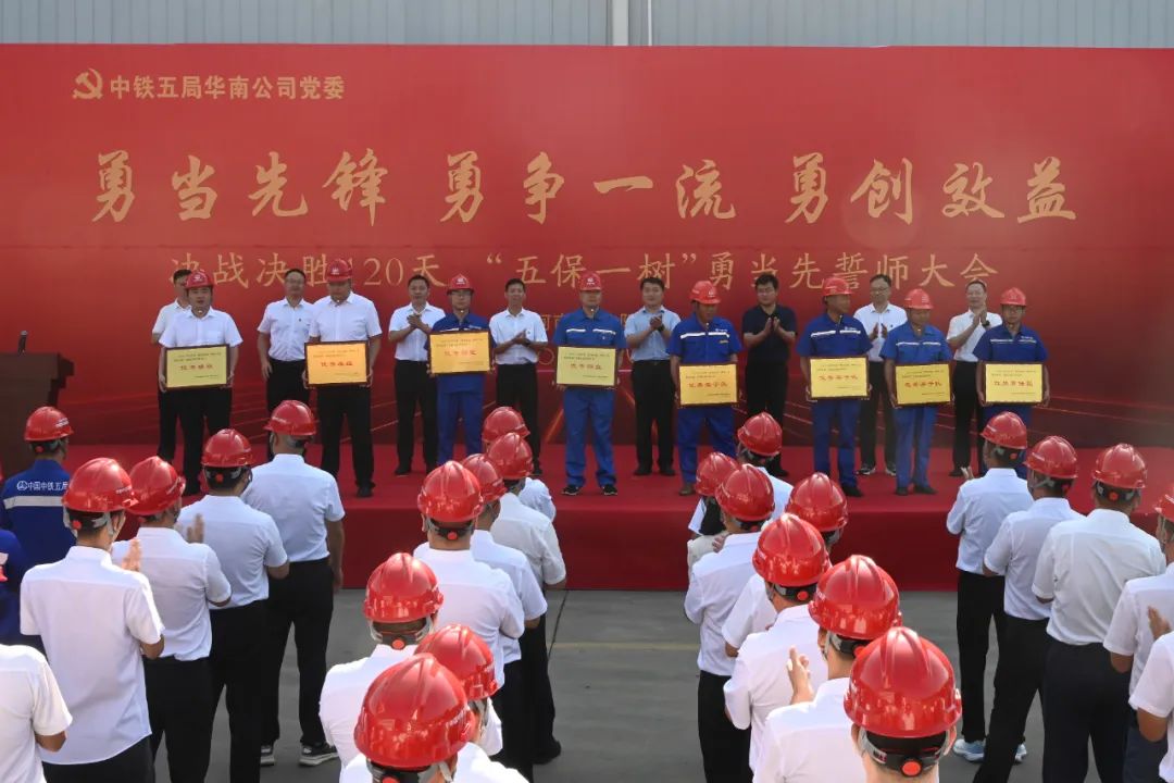 8月11日上午,中铁五局华南公司党委在大别山高速项目召开“勇当先锋、勇争一流、勇创效益,决战决胜120天、‘五保一树’勇当先”誓师大会。新县县委常委、组织部部长杨勇,河南交投商罗高速公路公司党委副书记、总经理赵新征,中铁五局纪委副书记林锦祥、党委组织部部长冷国强,华南公司党委书记、执行董事张涛,党委副书记、纪委书记何志平,党委委员、工会主席冯国安,副总经理兼大别山高速项目经理梁骥出席大会。大会由何志平主持。