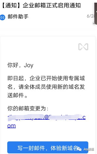注册域名这里 1元 购买注册域名,根据提示一步一步进行操作,成功后 企业微信端-邮件 选项卡里会收到一个提醒,@后面的部分即为公司的域名。