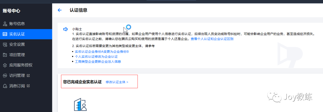 选择了平台后在平台上注册一个用户,并进行企业认证。(我这里已经完成了企业认证,如果开始是个人认证,点击后面的【修改认证主体】按提示一步步操作认证。