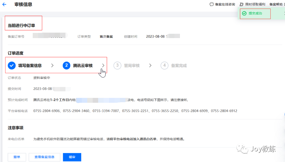 提交后会收到回执和提交成功的提示,到这时候内部操作就算OK了。之后的步骤是等待腾讯云的审核和管局的审核,根据腾讯云的提示,一个月内可以完成整个备案流程。