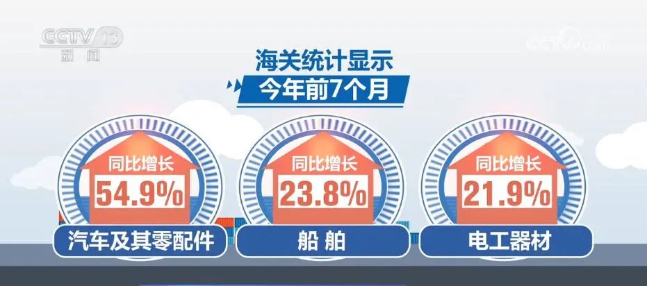 海关统计显示,今年前7个月,我国机电产品出口占比提升,汽车及其零配件、船舶、电工器材同比分别增长54.9%、23.8%、21.9%。