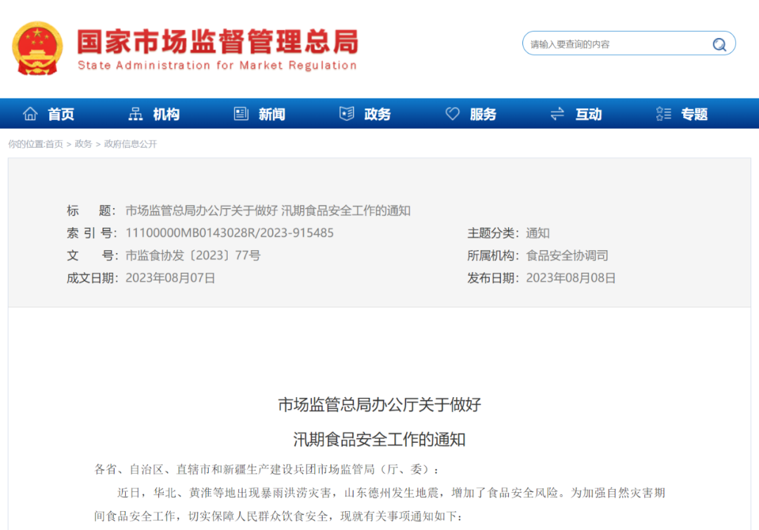 近日,华北、黄淮等地出现暴雨洪涝灾害,山东德州发生地震,增加了食品安全风险。为加强自然灾害期间食品安全工作,切实保障人民群众饮食安全,现就有关事项通知如下: