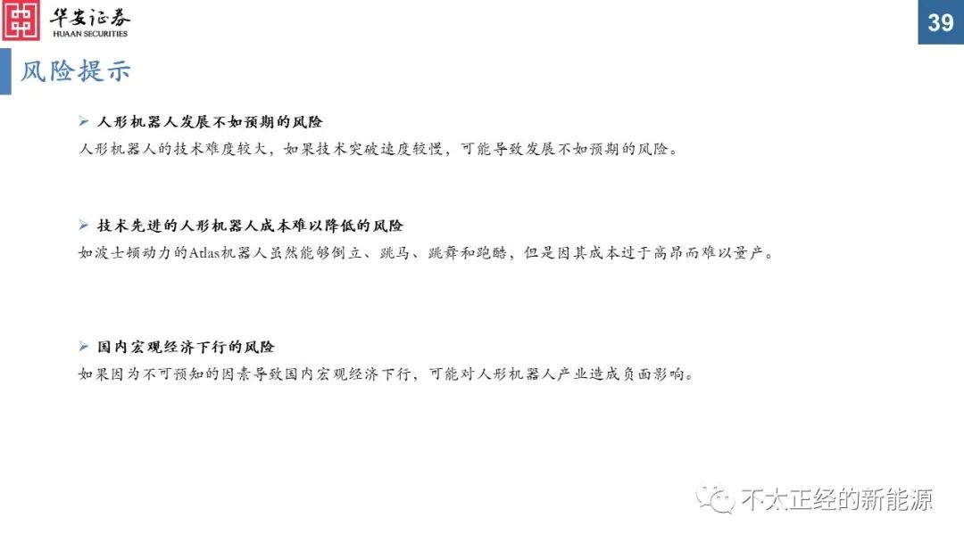 人形机器人发展不如预期的风险、技术先进的人形机器人成本难以降低的风险、国内宏观经济下行的风险。