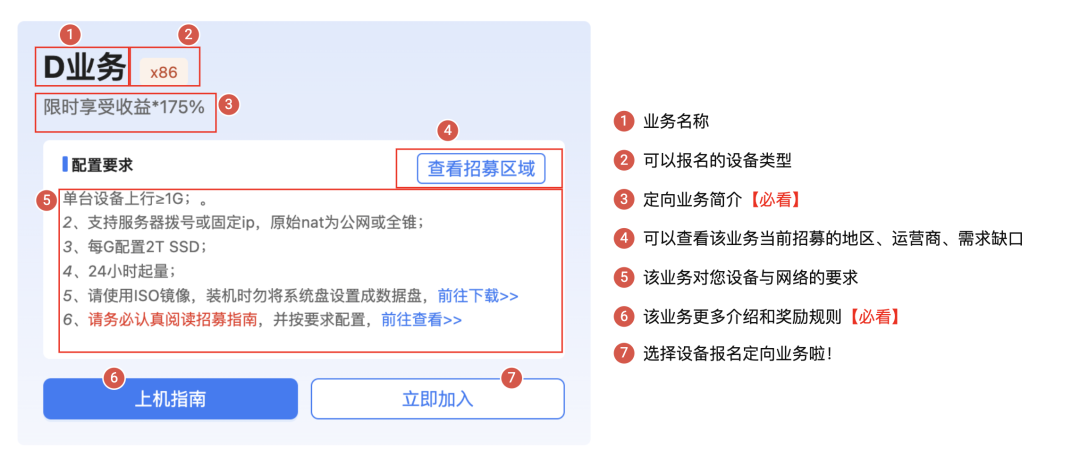 步骤4:点击【上机指南】可查看更多要求,务必看完才能保证收益妥妥到手哦!看完后点击【立即加入】选择设备报名就好啦!