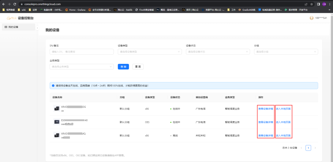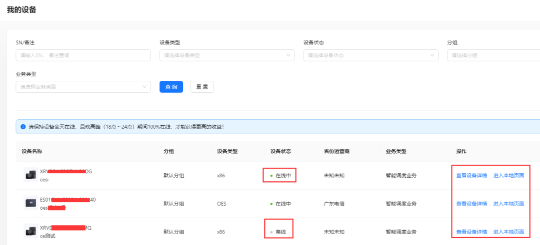 支持批量查看设备SN、分组、在线状态等信息