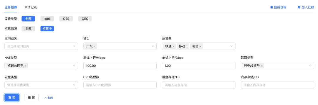 输入您的网络与设备资源信息,点击【查询】即可筛选出您可报名的定向业务。