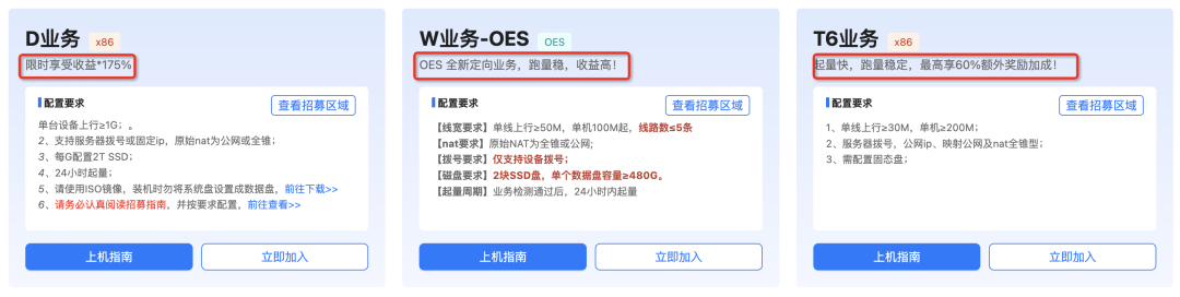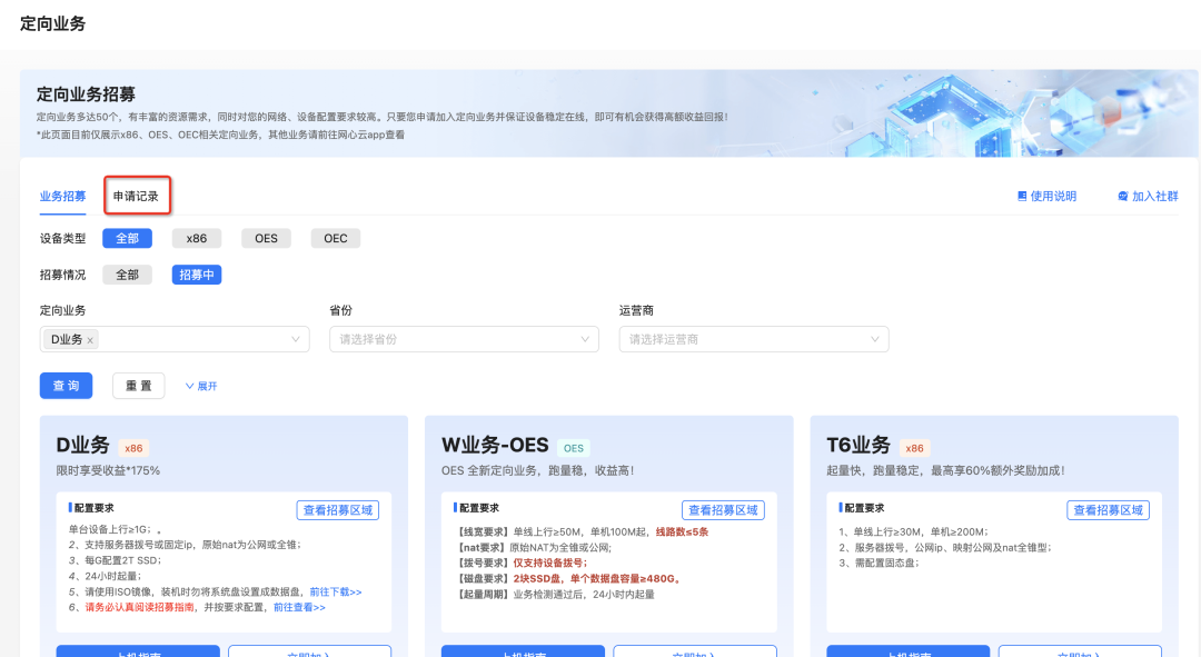 定向业务是面向资源更高的用户推出的业务,报名后可以获得专属业务部署,同时对您的网络、设备配置要求较高。只要您申请加入定向业务并保证设备稳定在线,即可有机会获得高额收益回报!