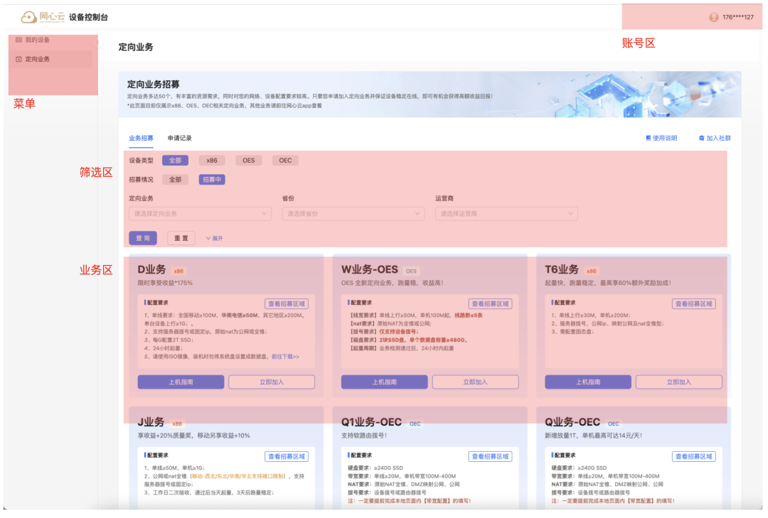 业务区:可以供您挑选业务、查看上线要求与报名加入。