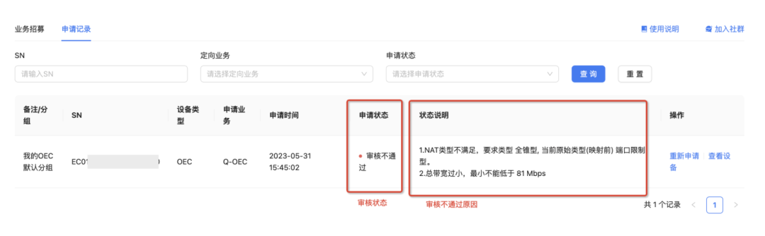 【申请记录】中可以看到您设备的审核状态,如审核未通过,可以查看到审核不通过的原因