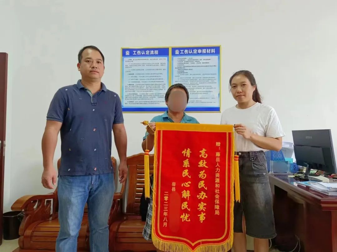 “感谢人社局,有这么好的为民办事服务,帮我这个外地来藤县务工时受伤的人,在找了好多次公司都不愿意赔医药费、又不帮申请工伤的情况下,能多方面联系公司促进办理认定工伤,也只有你们能帮忙办得到。现在我也得到了公司支付的工伤赔付费用。”劳动者在送上锦旗的时候激动的致谢。