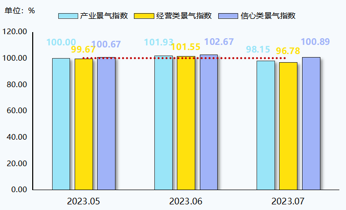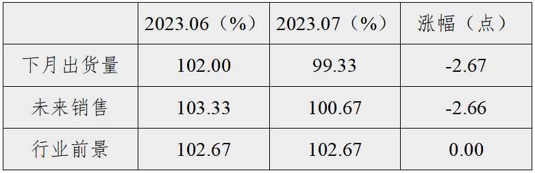 信心类景气指数小幅回落但仍处于景气区间,指数收报于100.89点,较上期回落1.78个百分点。各细分指标呈“一平二落”走势,具体来看,行业前景指数与上期保持一致,指数收于102.67点;下月出货量、未来销售指数较上期有所回落,指数分别收报于99.33点、100.67点。