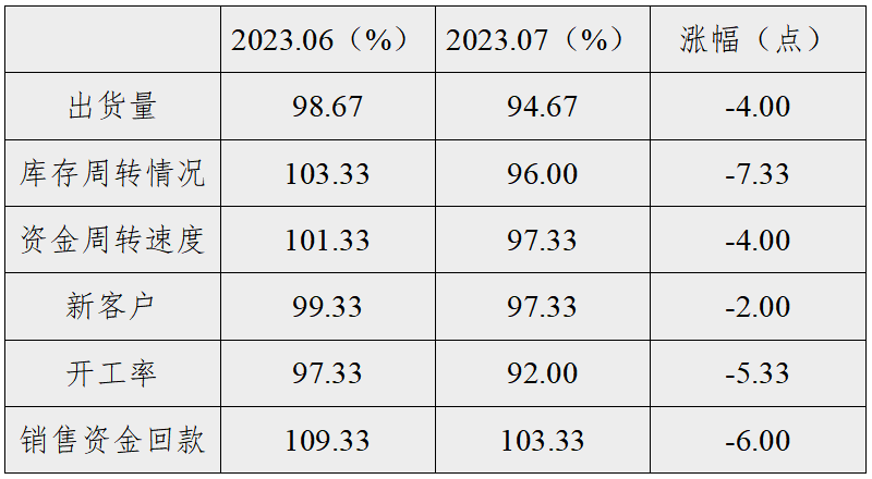 经营类景气指数回落至荣枯线下,指数收报于96.78点,较上期回落4.77个百分点。细分指标指数较上期均有所回落,仅销售资金回款指数在荣枯线上水平,指数收于103.33点;出货量、库存周转情况、资金周转速度、新客户、开工率指数分别收于94.67点、96.00点、97.33点、97.33点、92.00点。