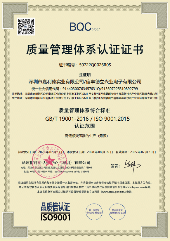 深圳市嘉利德实业有限公司/信丰德立兴业电子有限公司正处于快速发展期,为了促进公司的规范化、标准化管理,提升服务意识、服务质量,提高顾客满意度,公司决定导入质量管理体系。通过认证后公司更加能够证明有能力满足顾客和法律法规的要求,增强顾客满意度,增强社会知名度,取得更显著的社会效益。