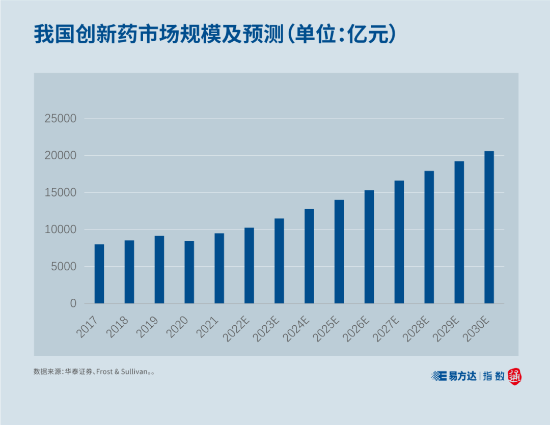 未来,创新药有望成为医药主要增长点。Frost & Sullivan数据显示,2021年,我国创新药市场规模约9470亿元,预计到2030年将增加至2.1万亿元。
