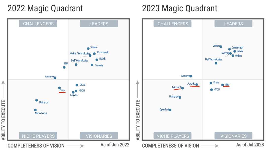 我们看到,厂商增长了Microsoft,去掉了Zerto。而Micro Focus被OpenText收购,该了一个名字。