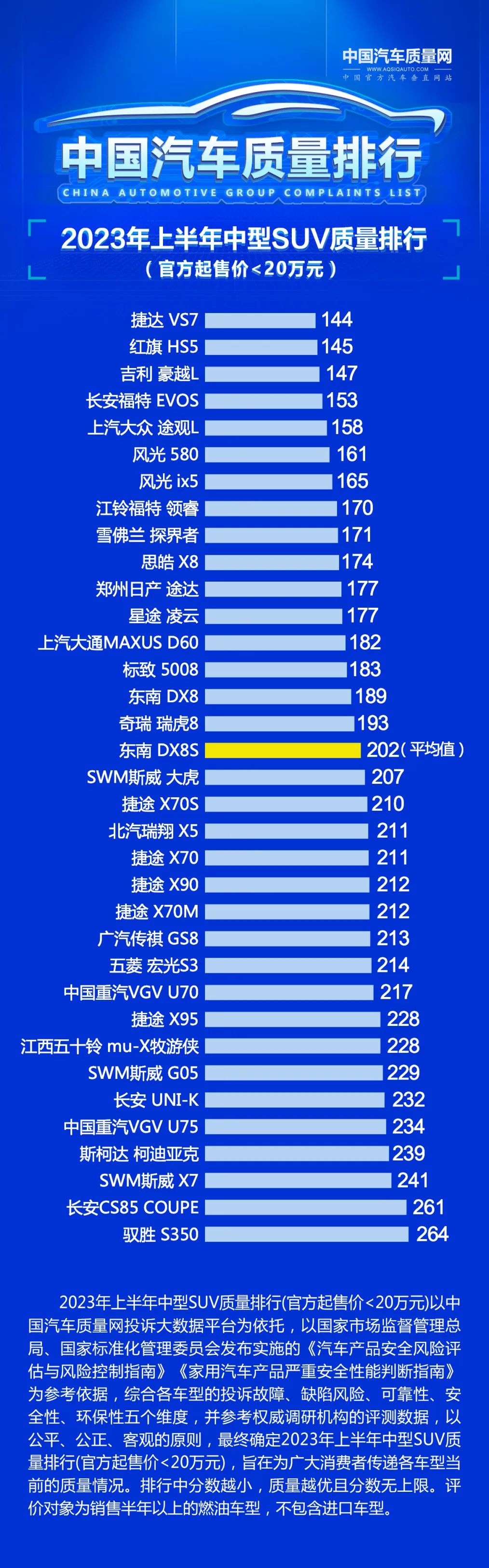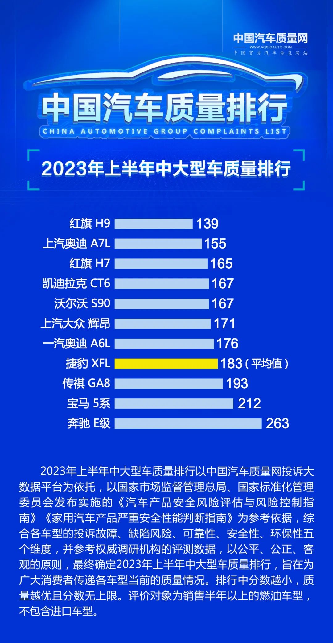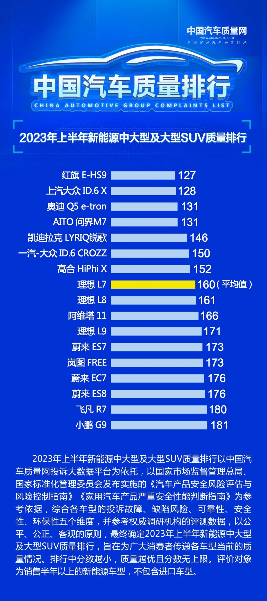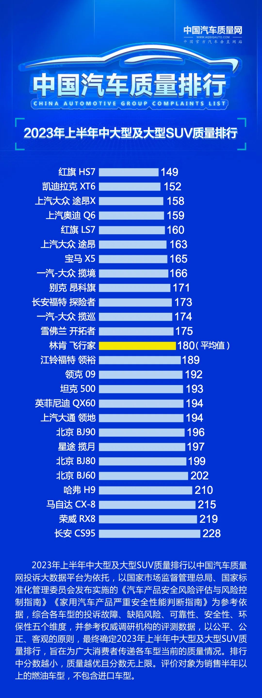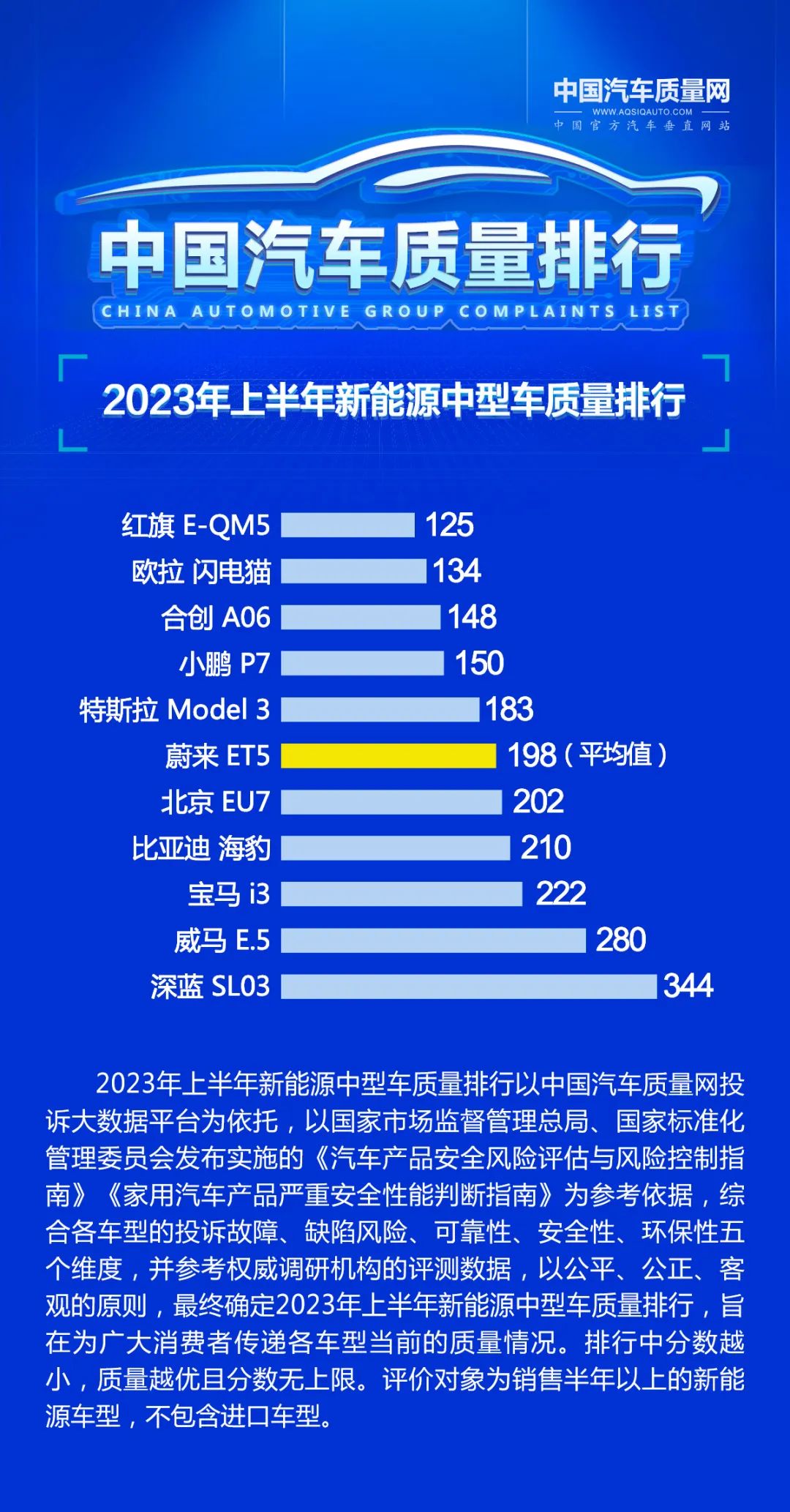 2023年上半年中国汽车质量排行以中国汽车质量网投诉大数据平台为依托,以国家市场监督管理总局、国家标准化管理委员会发布实施的《汽车产品安全风险评估与风险控制指南》《家用汽车产品严重安全性能判断指南》为参考依据,综合各车型的投诉故障、缺陷风险、可靠性、安全性、环保性五个维度,并参考权威调研机构的评测数据,以公平、公正、客观的原则,最终确定质量排行,旨在为广大消费者传递各车型当前的质量情况。排行中分数越小,质量越优且分数无上限。
