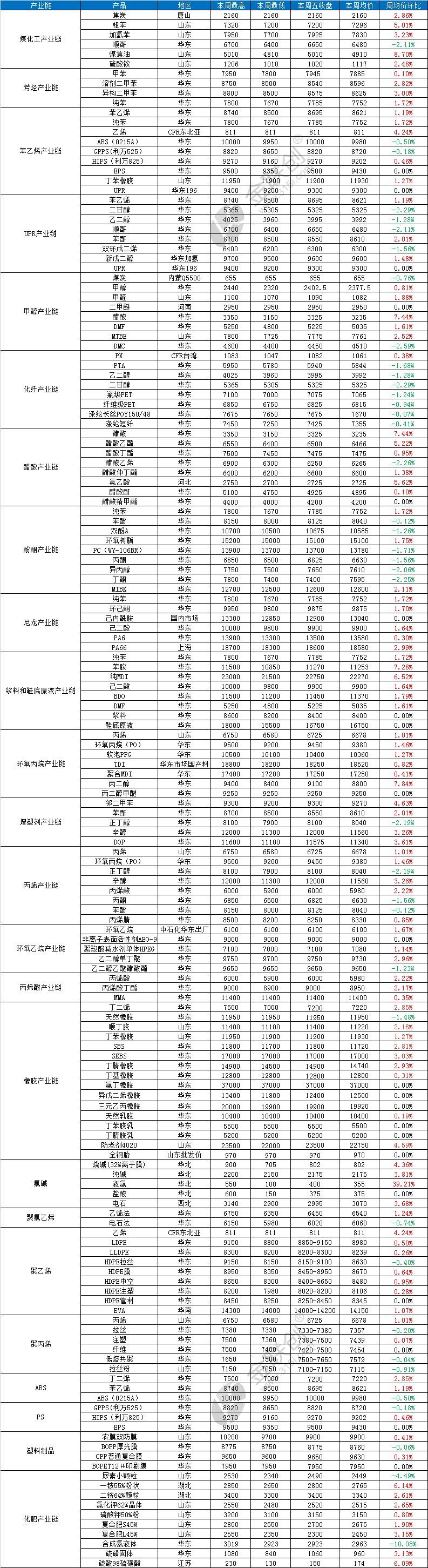 81个上涨品种中,涨幅最大3个品种分别是液氯(39.21%)、煤焦油(8.70%)、丙二醇(7.84%);31个下跌的品种中,跌幅最大3个品种,分别是合成氨液体(-10.08%)、尿素小颗粒(-4.49%)、DMC(-2.59%)。