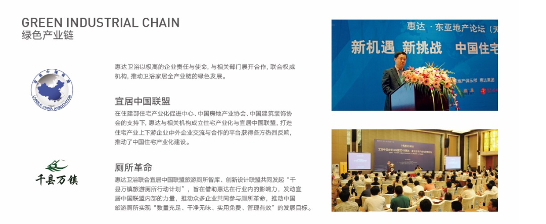 惠达卫浴一直坚持绿色可持续发展的道路,注重保护环境,节约资源,不断应用新技术、新材料,其中纳米自洁釉技术、节水技术、无公害可回收材料等环保新技术的应用,把对用户的健康和对环境的友好提升到了一个新的战略高度。