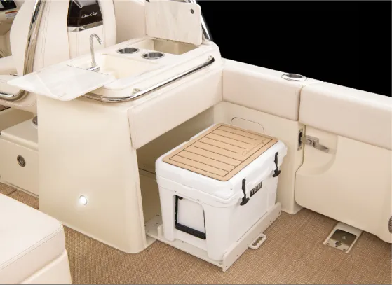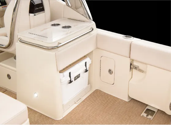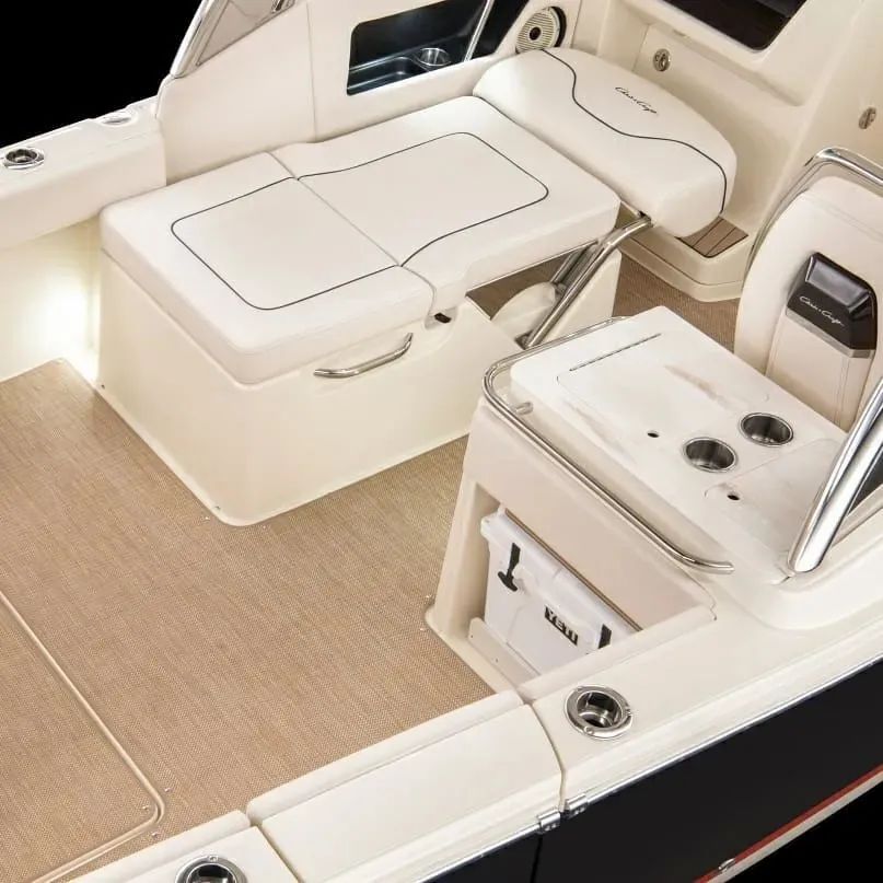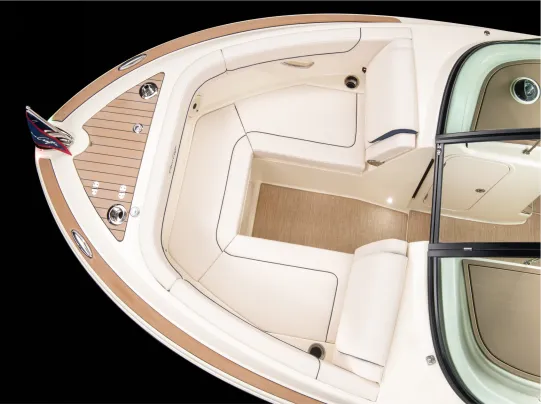 右舷配有淡水水龙头、水槽以及简易工作面板,下方是使用SofTeak垫的滑出式冷却箱,这里可以当做简易厨房。尾部沙龙区配有一张可折叠柚木桌,非常适合用餐和社交。当您在乘风破浪、抛锚和停泊码头时,船艏都是视野极佳的地方。您可以将饮料放置在两侧的不锈钢杯架中,也可以将随身携带物件放置靠背以及座位底下的储物空间,安全且防水。