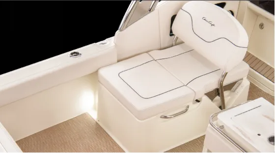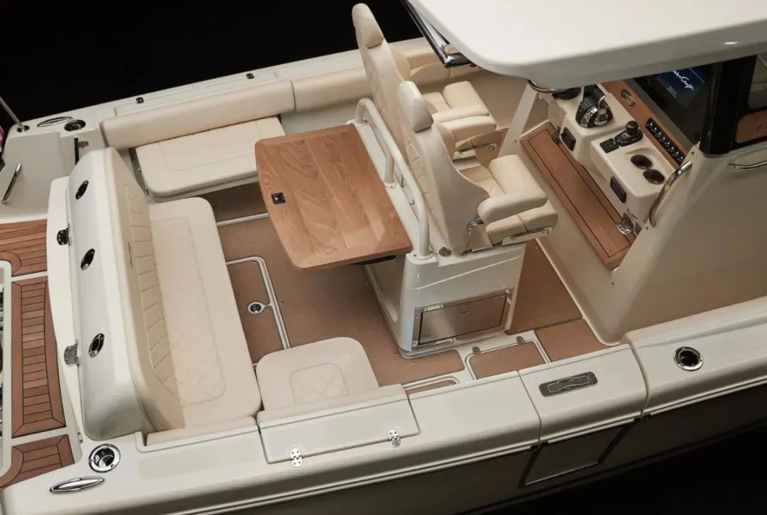 卡塔琳娜30拥有宽大的船头,提供卓越的稳定性,船艏是舒适社交且视野极佳的地方。双人U型靠椅,左右两侧及中间各有可折叠扶手,并配有不锈钢杯架,让您在船艏也能享受轻松自在!