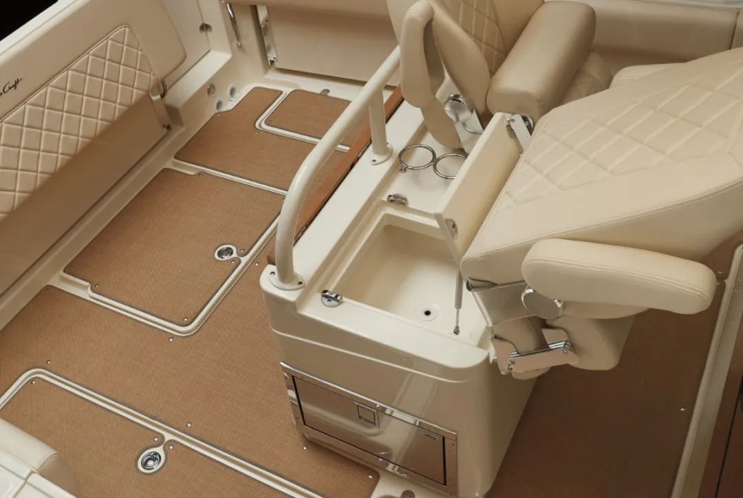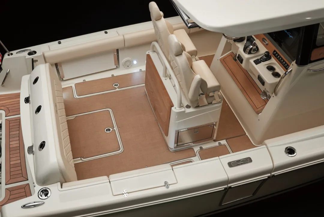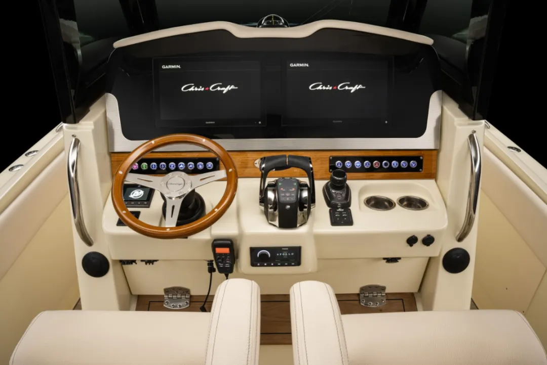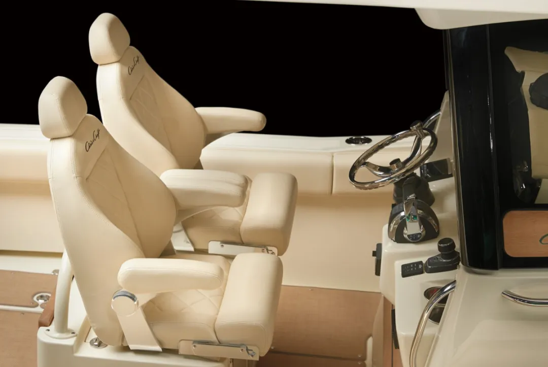 卡塔琳娜30中央驾驶台的设计,全遮蔽驾驶舱位于船中部,让驾驶者左右视线一致,驾驶更加容易。只需按下一个按钮,可伸缩遮阳板便可向后滑动。驾驶区配备了佳明电子屏幕,该屏幕集成了引擎功能、立体声功能播放和所有导航需求。