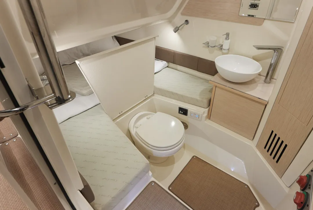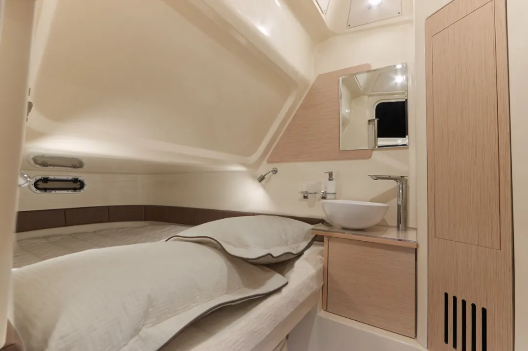 卡塔琳娜30尾部沙龙区有多种不同场景,当您想休闲垂钓时,可将座椅折叠起来,增大沙龙区活动空间。当您想和好友休闲地享受下午茶时光,可以选择将座椅和柚木桌打开,即刻开启度假模式。卡塔琳娜30标配有一个房间,从左舷的驾驶舱门滑动打开即可进入房间。当您疲惫时,可在房间惬意休息。