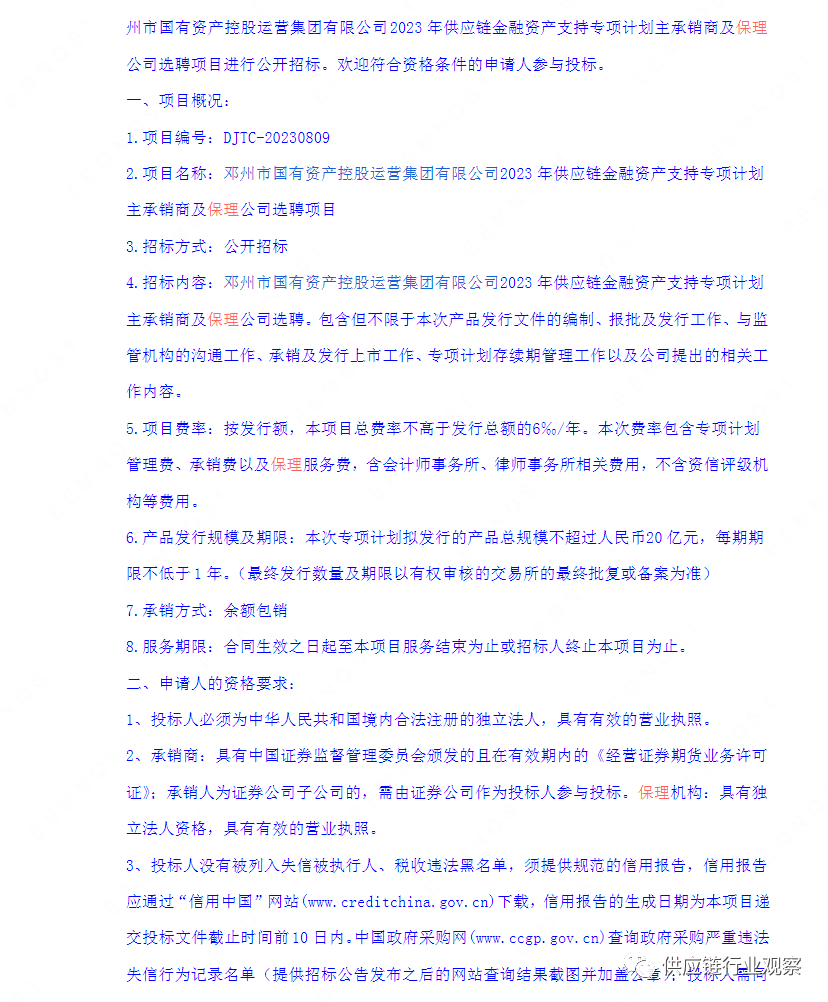 邓州市国有资产控股运营集团有限公司2023年供应链金融资产支持专项计划主承销商及保理公司项目进行招标。