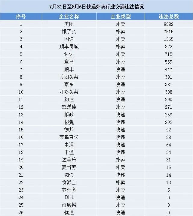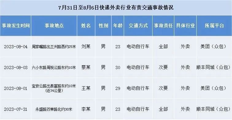 现将7.31-8.6本市快递外卖行业交通事故、违法情况公布如下: