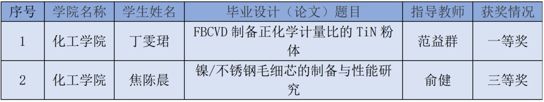 近日,省教育厅公布了2022年度江苏省普通高校本专科优秀毕业设计(论文)评选结果。经学校申报、专家评审和专委会审定,化工学院丁雯珺同学《FBCVD制备正化学计量比的TiN粉体》毕业论文(指导教师:范益群教授),荣获一等奖。焦陈晨同学《镍/不锈钢毛细芯的制备与性能研究》毕业论文(指导教师:俞健副教授),荣获三等奖。