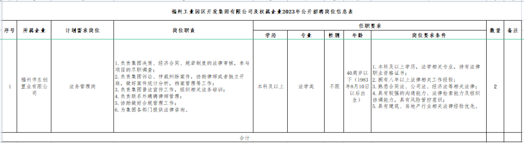 附件1:福州工业园区开发集团有限公司岗位信息表