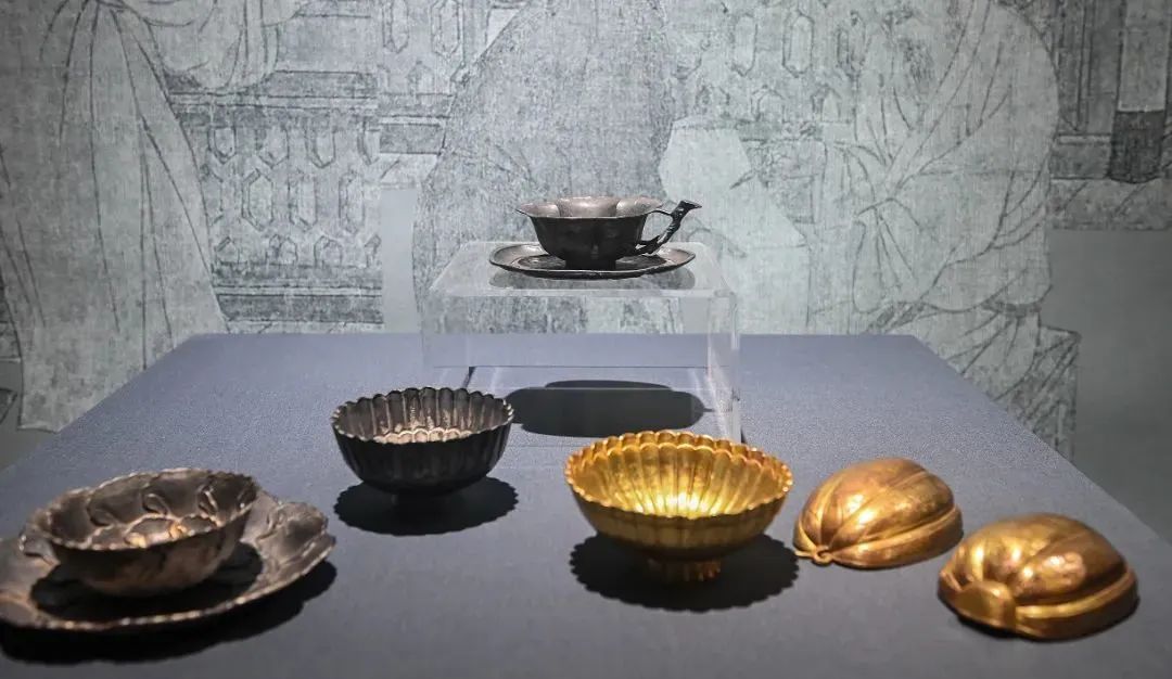 此次展览展出了一批彭州金银器窖藏酒器,有宋代凤鸟纹执壶、菊花金碗、瓜形金盏等。这批彭州窖藏被称为“天下金银第一窖”,是了解研究宋代金银器的必看文物。此次展览展出的易县金银器窖藏出土器物,其质地之精美世所罕见,展示了延续千年的奢华之韵。