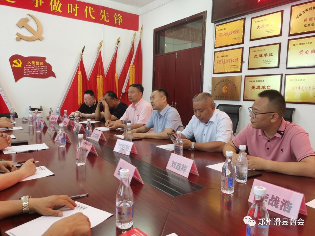 在商会会议室,会长王红强致辞欢迎并介绍说,郑州滑县商会从筹备到运营8年来,被郑州市民政局、郑州市工商联、滑县工商联认定为标准化商会,连续五年评选为先进组织、优秀商会、先进基层党支部、河南省“四好商会”等荣誉,是河南省发改委“两新组织”党建指导处,