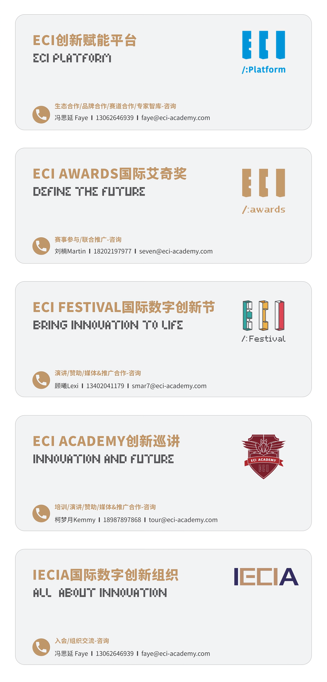 The ECI Awards(known as Entrepreneurship, Creativity & Innovation Awards), founded in 2014, is initiated jointly by Chinese scholars and global innovative digital business experts who from 27 countries and regions that activated by an educational institute of philanthropic, academic and independent studying(IECIA). The ECI Awards, being the first universal honor which implementing an evaluation standard remarked as "The effectiveness of Innovation" in the field of digital creativity worldwide. It recognizes those people and organizations who achieve excellent achievements on business models, products, services, technologies, marketing and managing, inspiring the implementing of commercial and creative industries around the world. The ECI Awards, the "Nobel Prize" of the most authorized and effective digital economic innovation, is guiding application of innovation, defining the future.