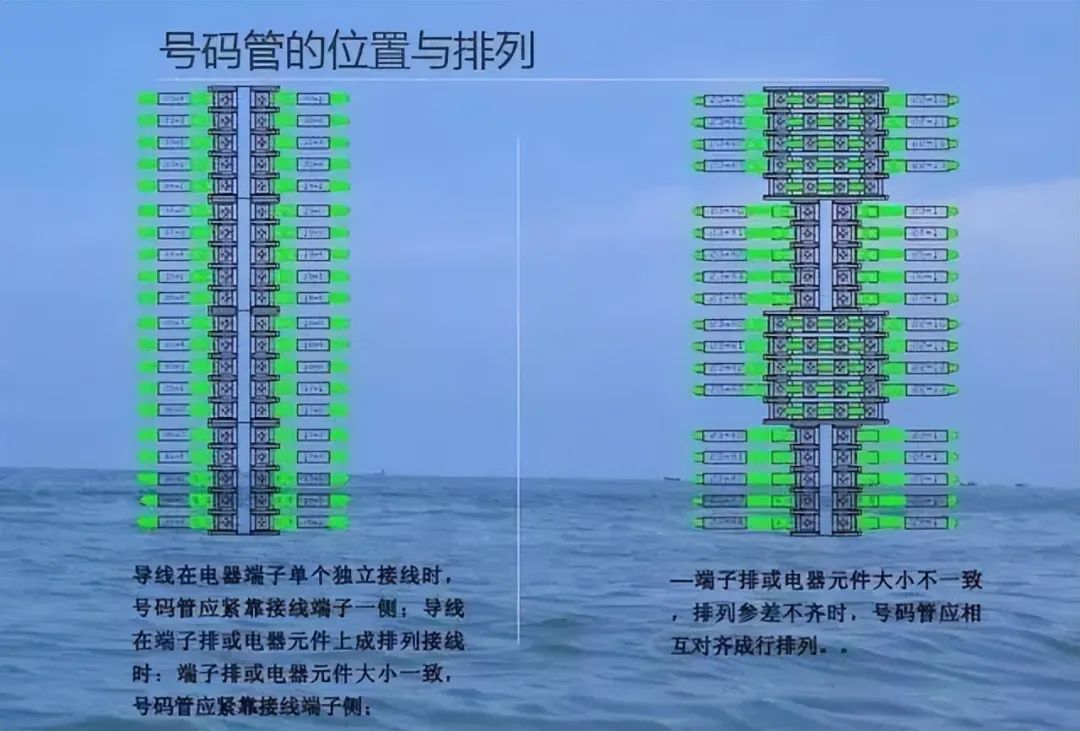 1、端子排或者用电设备大小不一,排列参差不齐时,号码管应相互对齐,排列成行。