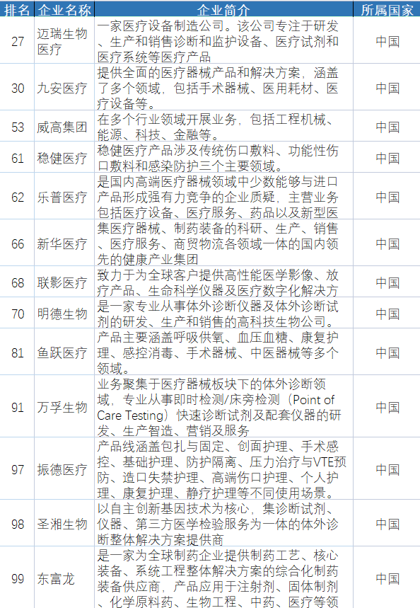 本次百强榜单中有 13家来自中国的公司上榜,分别是联盟成员-迈瑞医疗(27)、九安医疗(30)、威高集团(53)、稳健医疗(61)、联盟成员-乐普医疗(62)、新华医疗(66)、联影医疗(68)、明德生物(70)、鱼跃医疗(81)、万孚生物(91)、振德医疗(97)、圣湘生物(98)、东富龙(99),企业相关详情如下: