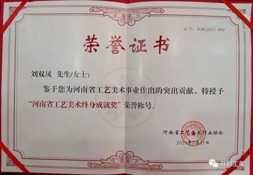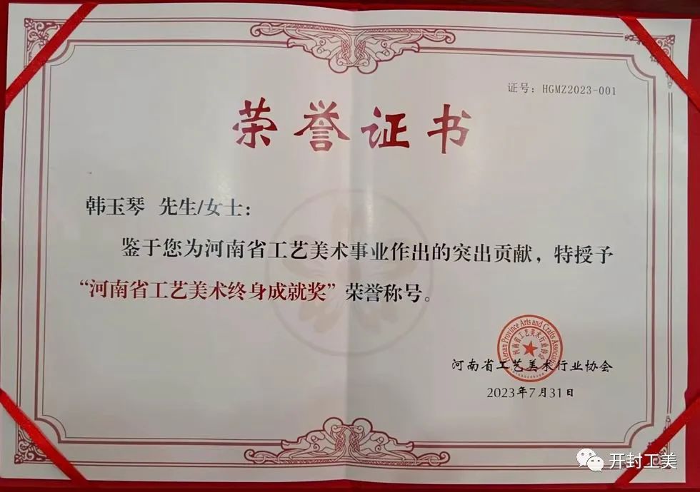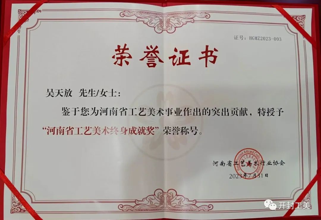 河南省工艺美术终身成就奖是河南省工艺美术界的最高荣誉称号,共授三次,第一次是2015年,全省三位大师,开封一人王素花大师。第二次是2019年,全省十四位,开封两位杜秀芬,何浩庄大师。这次是第三次全省三位,韩玉琴,刘双凤,吴天放大师。